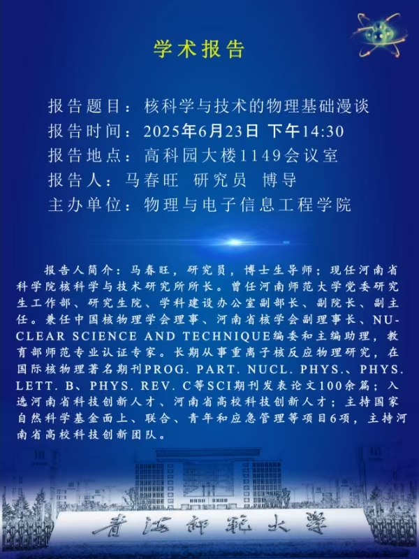 为进一步增进校内外学术交流,拓展校内师生科学研究视野,公司特邀请河南省科公司核科学与技术研究所所长马春旺研究员,于2025年6月23日(星期一)14:30在高科院大楼1149会议室举办“核科学与技术的物理基础没谈”为主题的学术讲座,欢迎届时参加交流。